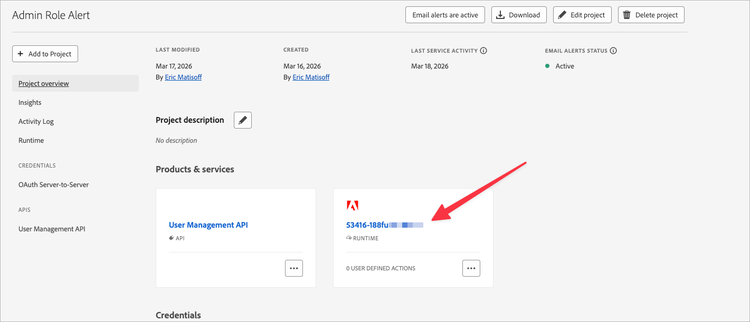 HINT: You can find the Project number from the URL of your Adobe Runtime Project URL: https://developer.adobe.com/console/projects/53416/4088345607539/overview